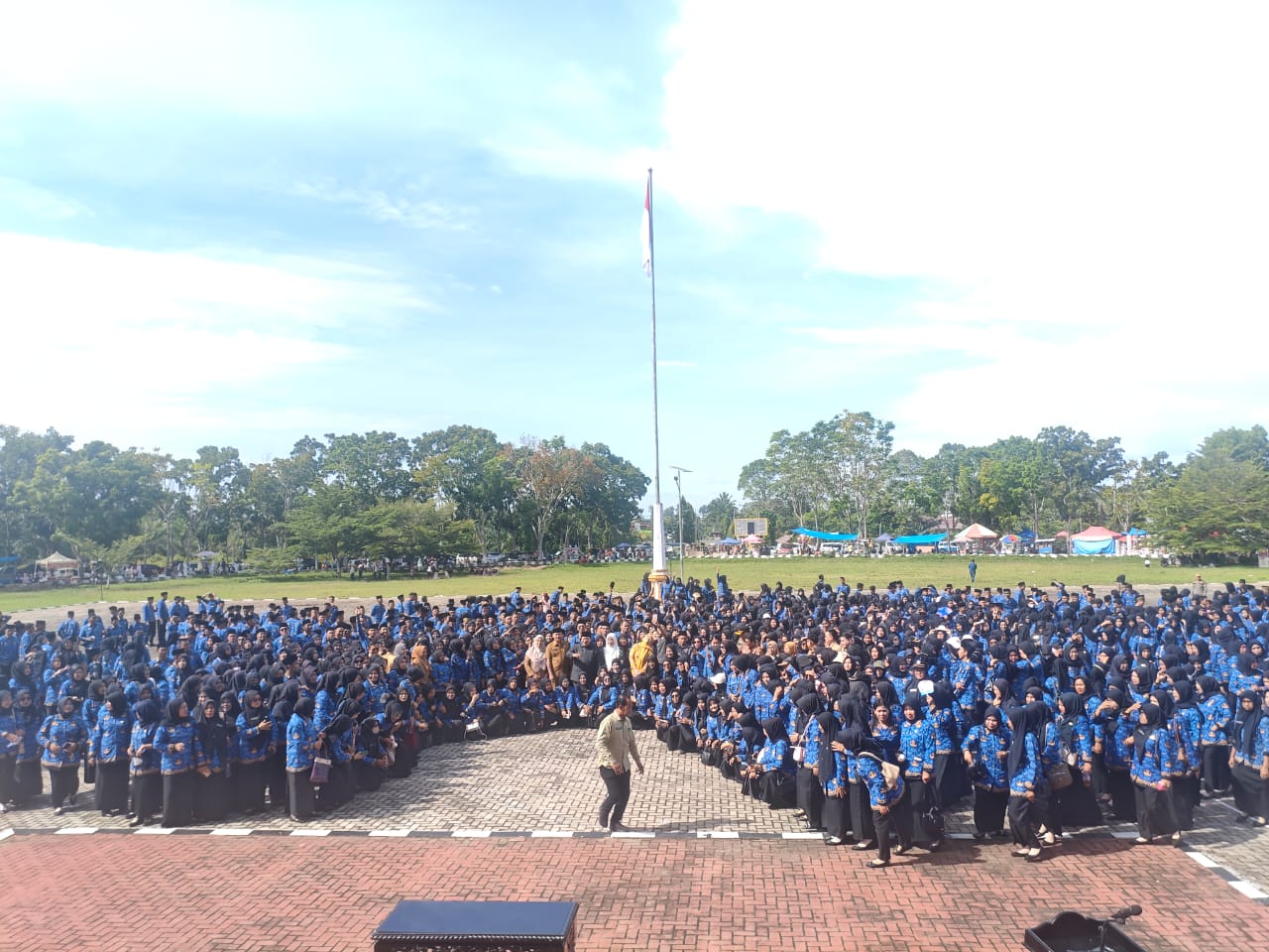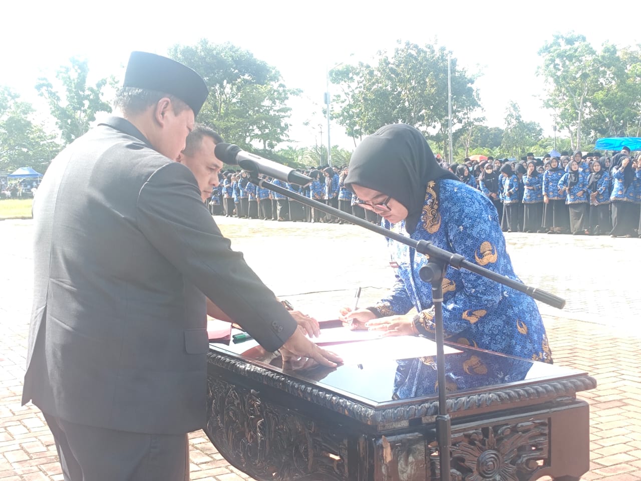 Penyerahan SK berlangsung di halaman kantor bupati, dihadiri wakil bupati, ketua DPRD, Sekda, ketua TP-PKK, Kepala BKPSDM dan segenap pejabat lainnya
